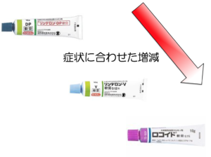 ステロイドの強度が強いほど、炎症や痒みを抑える効果が高い一方、ステロイド皮膚症を引き起こす可能性も高くなると考えられております。(その他、薬の基剤や頻度によっても可能性が左右されます。)その為、症状の緩和に合わせて、ステロイドの強度を下げていく必要があります。