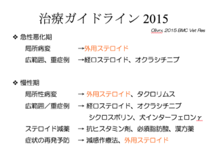 ここまでの解説を読んで、「ステロイドを使いたくない」と思った方もいるのではないでしょうか。気持ちはとても分かるのですが、ステロイドは使い方を間違えなければとても素晴らしいお薬です。実際、国際的な『犬アトピー性皮膚炎の治療ガイドライン』にステロイドが含まれております。局所性病変、つまり、症状が部分的な場合、外用ステロイド薬を使う事が推奨されております。