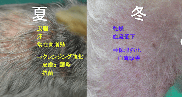 犬の体質や、元々持っている皮膚免疫のレベルによって、季節毎に皮膚の状態が変わってきます。私たち人間は、夏はさっぱり系/冬はしっとり系の化粧水を選ぶ方が多いように、1年中同じスキンケアをする人は少ないと思います。実は、犬のスキンケアでも同様です。愛犬の皮膚の状態を普段からよく見て、季節によってシャンプーや保湿剤を使い分けてみませんか?年間を通して見られる皮膚トラブルも減っていくかもしれません。
