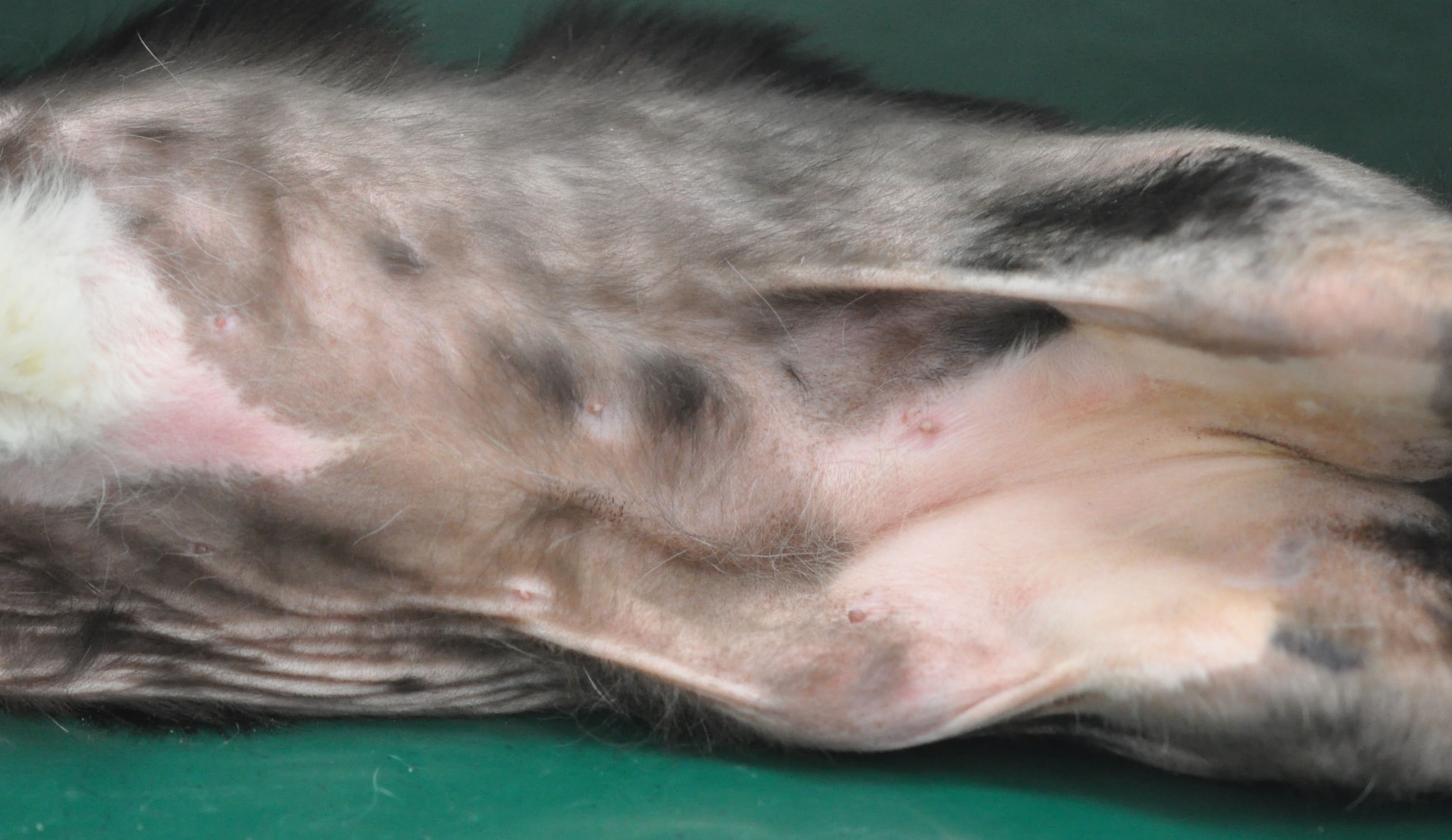 以下の写真のように赤みやブツブツが無くても、『外傷性脱毛』といった皮膚病の症状となります。この猫さん達は、アレルギーが原因で痒みが発症していた為、アレルギーに対する治療を行う事で痒みもグルーミングも減り、毛が生え揃いました。