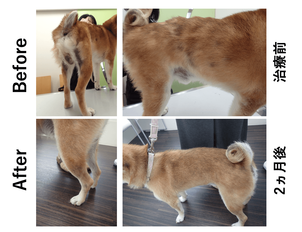 2ヶ月後の再診時、痒みはかなり軽減し、背中や太ももの脱毛部分はすっかり治っていました。(下写真参照)