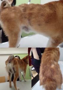 この柴犬さんは食物アレルギーが主たる皮膚病であり、更にアトピー性皮膚炎も併発していました。そこに、細菌感染が起こり、治りにくい皮膚の状態に陥っておりました。ガンコな痒みが続く犬の皮膚病は、幾つかの病気が入り混じっている事があります。その為、飼い主さんと獣医師が連携を取り、根気強く進めていくことが大切です。